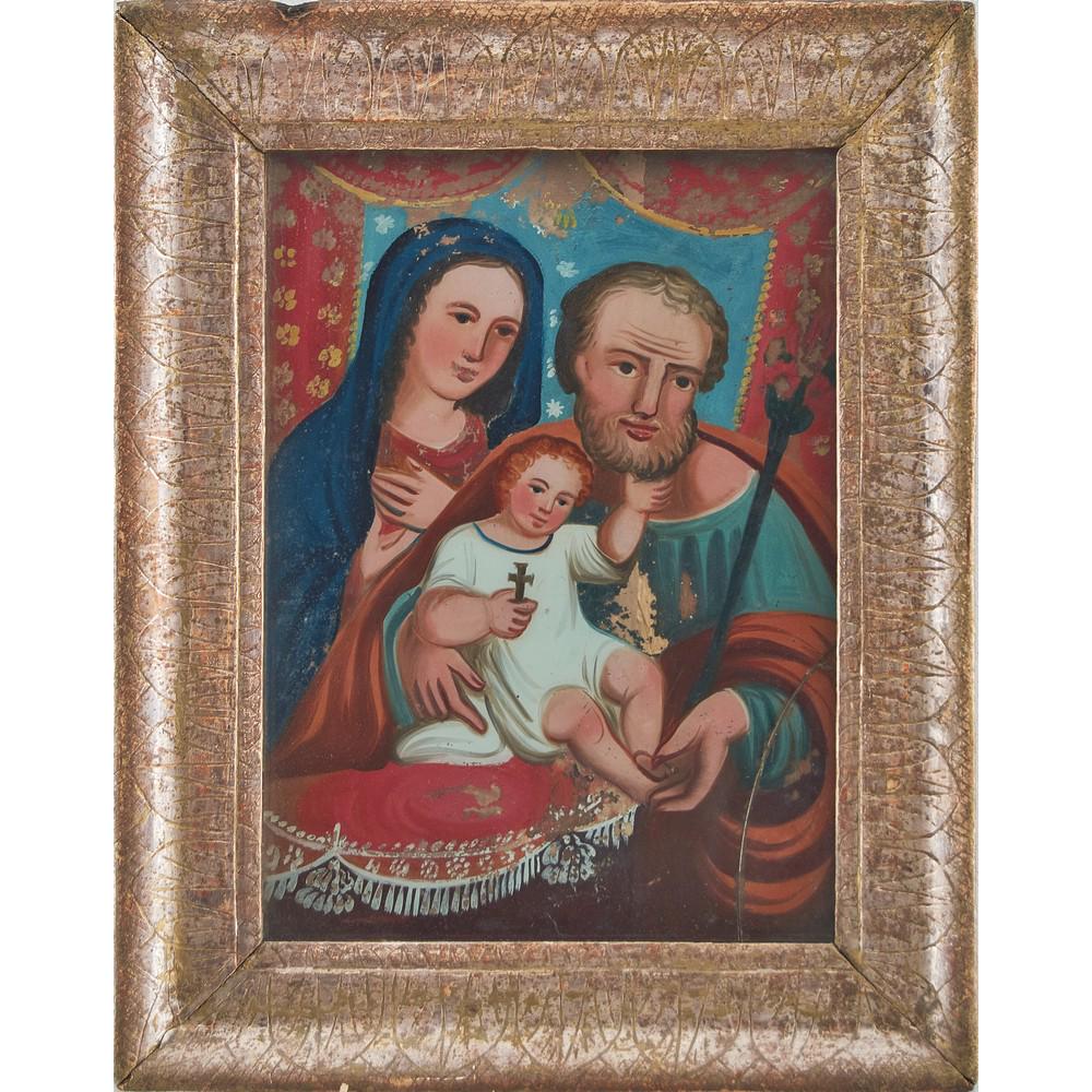 PITTURA su vetro "Sacra Famiglia" entro cornice in legno. Sicilia fine '800 Misure: cm 58 x